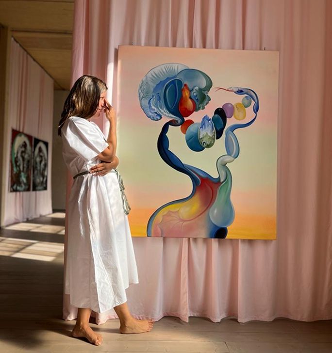 V autorčiných malbách najdeme odkazy na antiku, kubismus i surrealismus. Umělkyně vytváří magické světy robustních figur, které hrají v jednotlivých námětech specifické role, ať už se jedná o hlavičky plavců vynořujících se v gestu kraula nad hladinu bazénu, jež odkazují ke zcela konkrétní činnosti, nebo o těla zasazená do neurčitých prostředí, jejichž význam v dané situaci si musíme imaginovat sami. Jak autorka sama říká, v umění ráda nachází humor, hravost a ironii.
